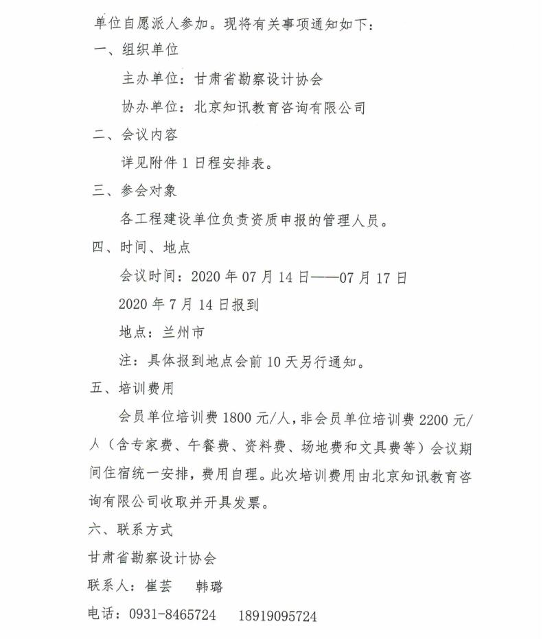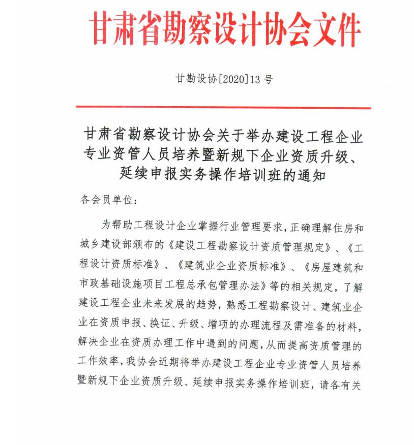 甘肃省勘察设计协会关于举办建设工程企业专业资管人员培养暨新规下企业资质升级、延续申报实务操作培训班的通知
